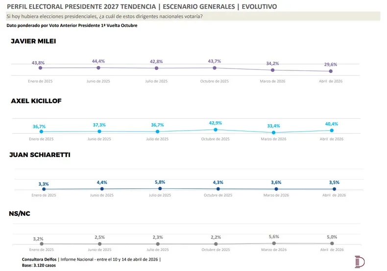 Mientras Milei cayó desde niveles superiores al 40% durante 2025 hasta 29,6% en abril de 2026, Kicillof pasó de 33,4% en marzo a 40,4% en la última medición.