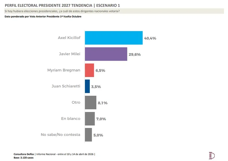 Una encuesta nacional realizada por la consultora Delfos volvió a mover el tablero político de cara a 2027. El relevamiento ubicó al gobernador bonaerense Axel Kicillof por encima del presidente Javier Milei tanto en una eventual primera vuelta como en un posible ballotage presidencial.