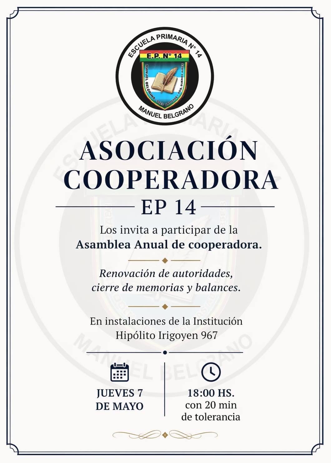 La Asociación Cooperadora de la Escuela Primaria N° 14 “Manuel Belgrano” convoca a la Asamblea Anual que realizará el jueves 7 de mayo desde las 18 horas, con 20 minutos de tolerancia, en las instalaciones de Hipólito Yrigoyen 967.